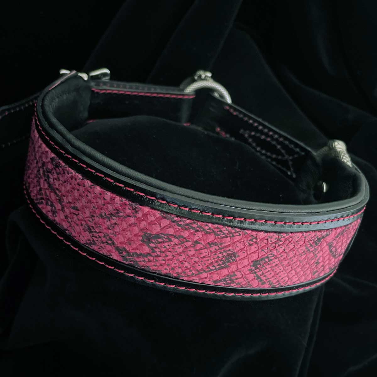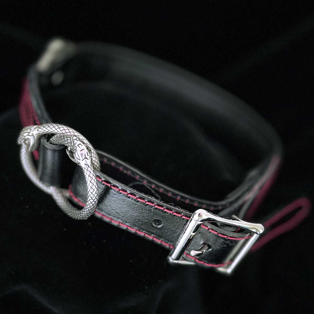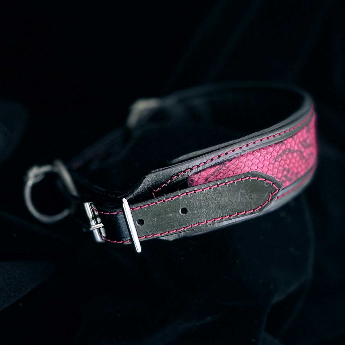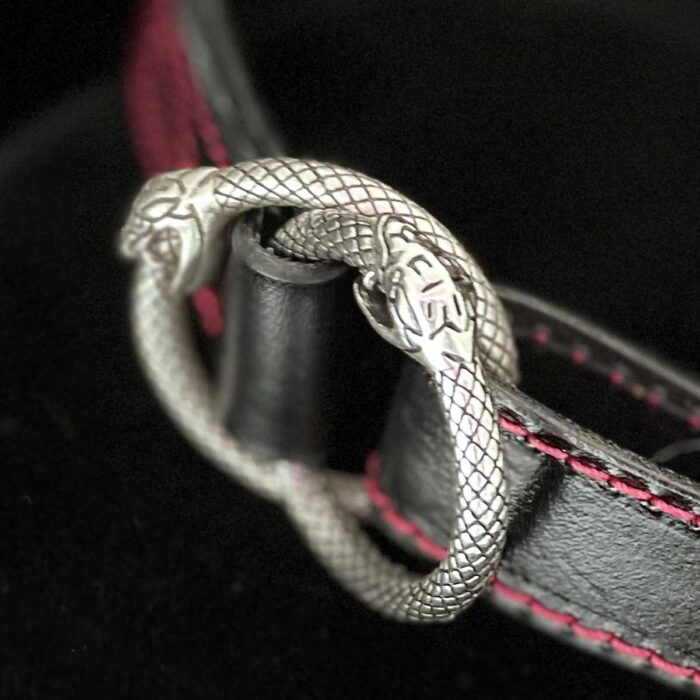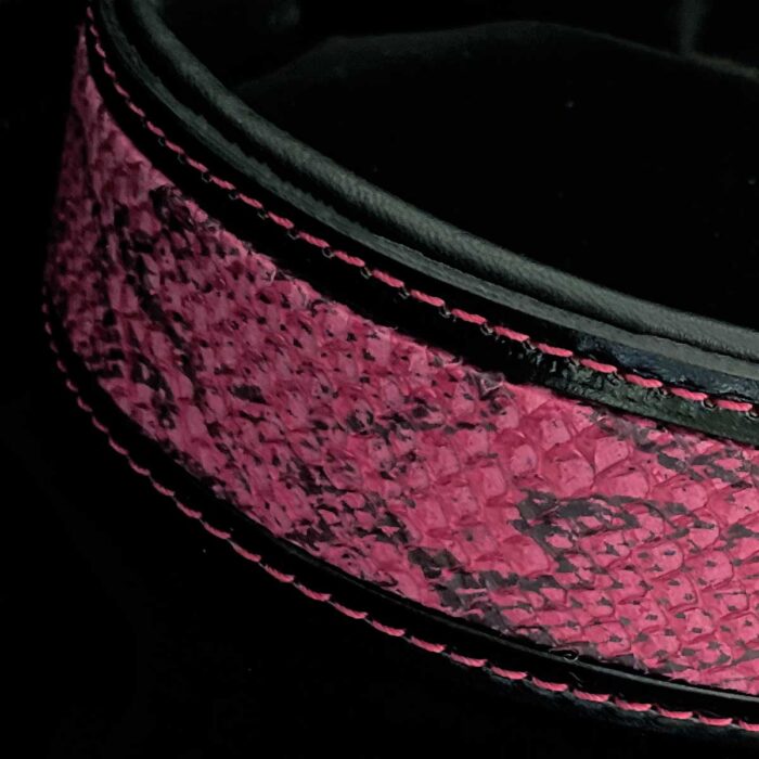 Das Deckleder ist 2mm dickes, schwarzes Rohleder vom Rind mit pinkem Lachsleder vernäht und softer Unterpolsterung aus schwarzem Lammnappa. Alles vernäht mit stabilem Sattlergarn. Die Beschläge sind aus altsilbernem, nickelfreiem Metall im Snakedesign.