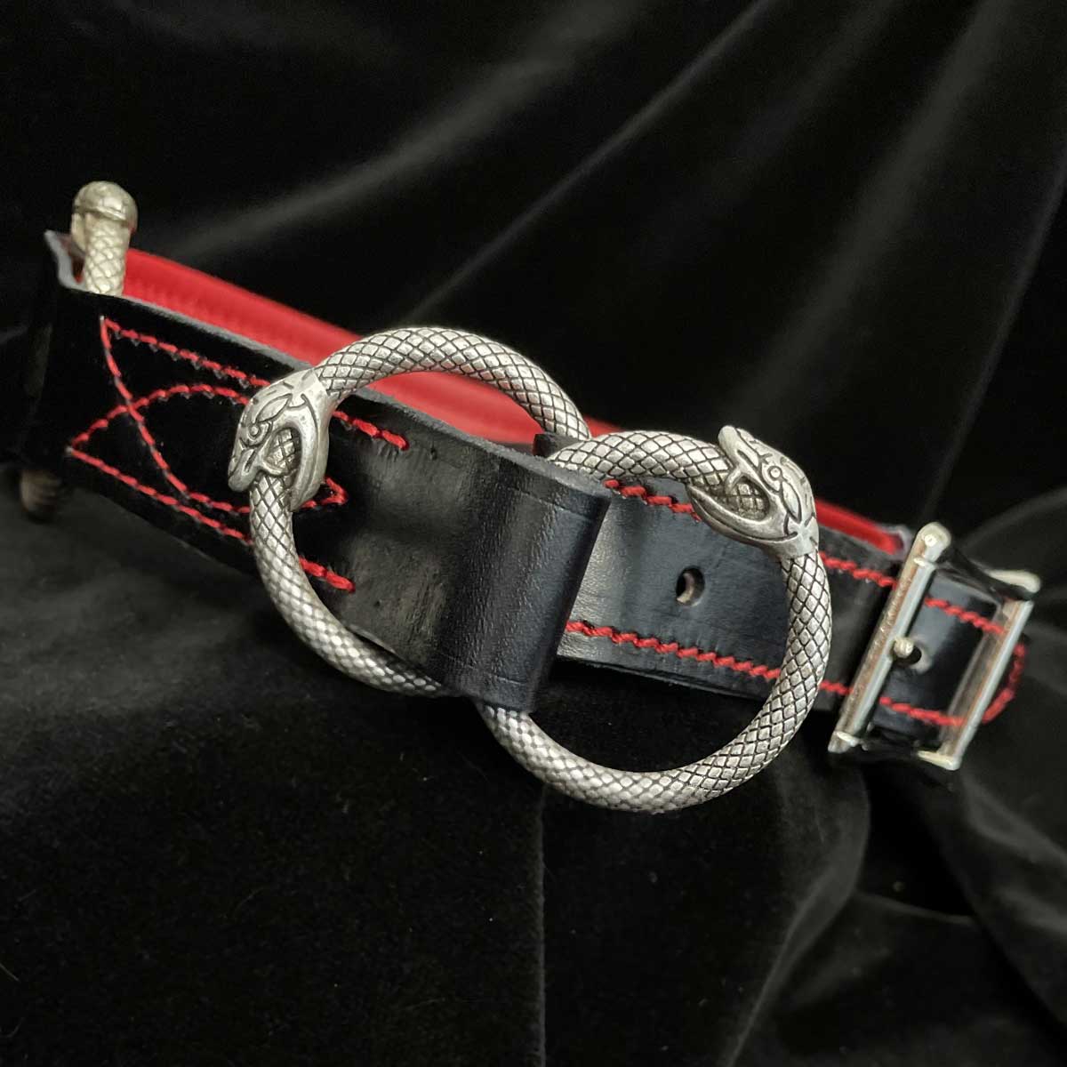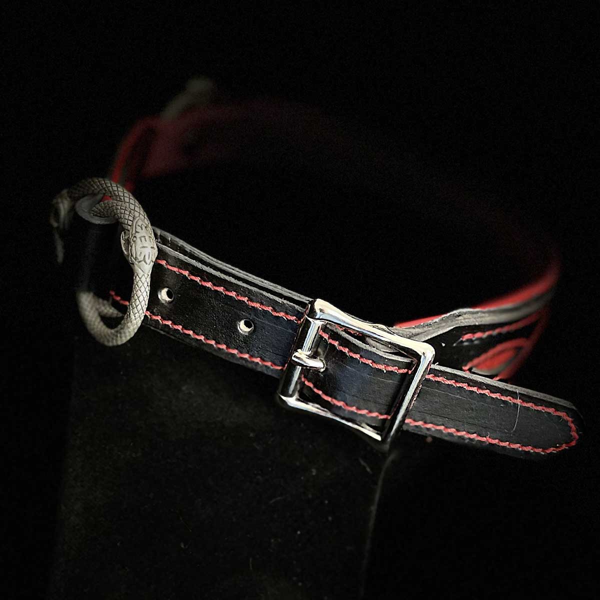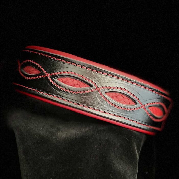 Das Deckleder ist 2mm dickes, schwarzes Rohleder vom Rind mit rotem Lachsleder vernäht und softer Unterpolsterung aus rotem Lammnappa. Alles vernäht mit stabilem Sattlergarn. Die Beschläge sind aus altsilbernem, nickelfreiem Metall im Snakedesign.