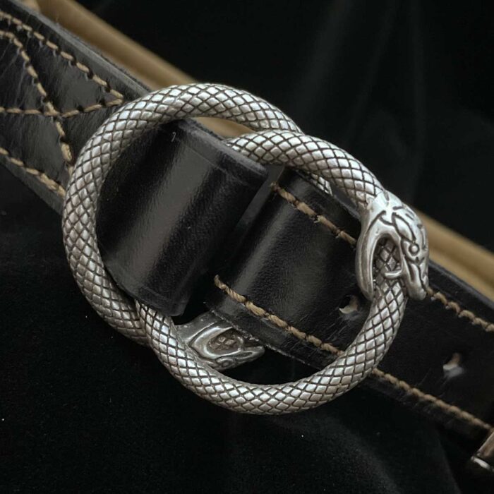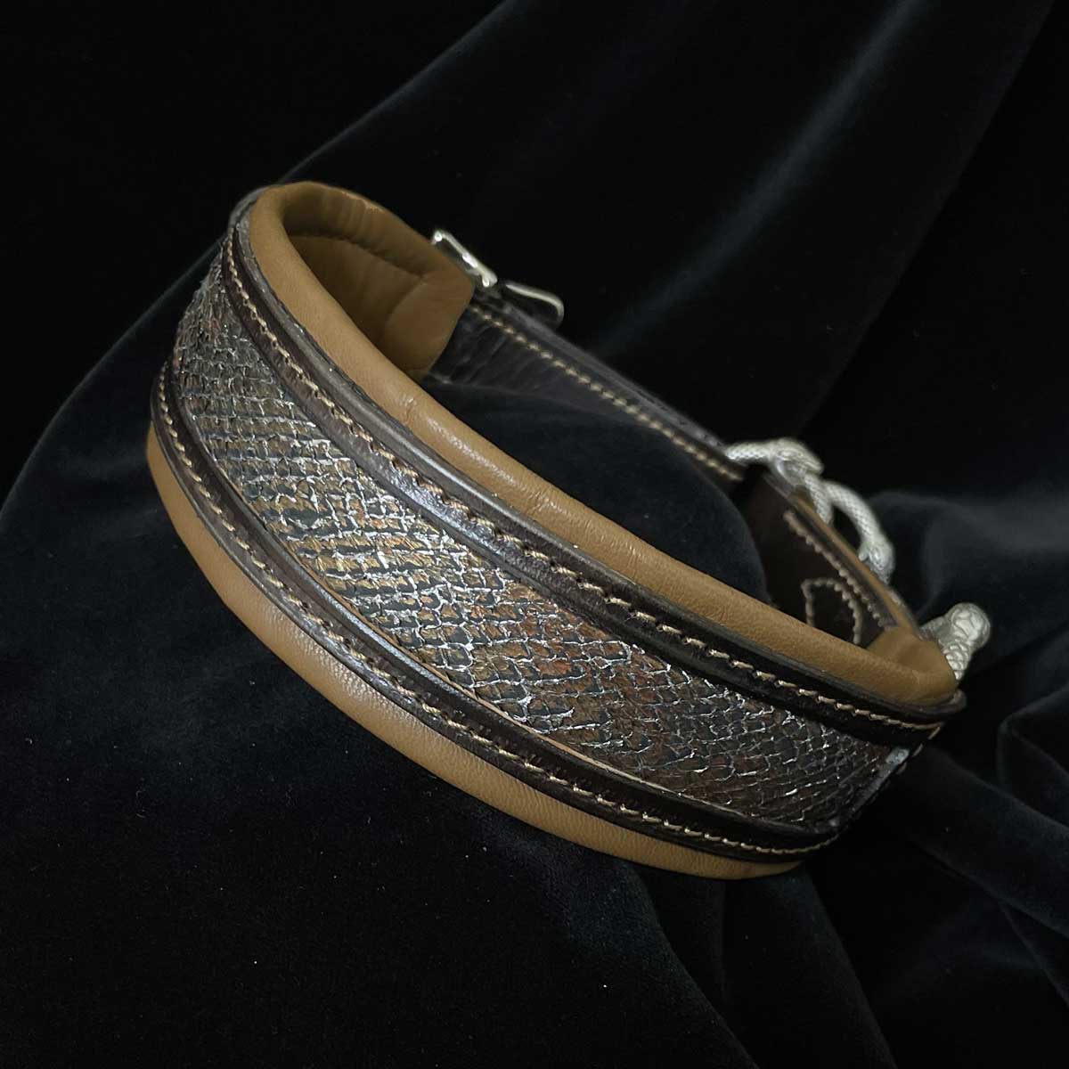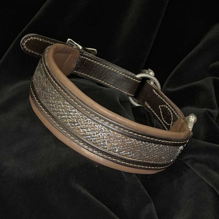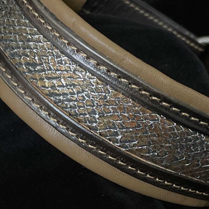 Das Deckleder ist 2mm dickes, dunkelbraunes Rohleder vom Rind und die softe Unterpolsterung besteht aus weichem, taupefarbenen Lammnappa. Das Inlay ist ein silber-braunes Lachsleder. alles vernäht mit stabilem Sattlergarn. Die Beschläge sind altsilberfarben aus nickelfreiem Metall im Snake-Design.
